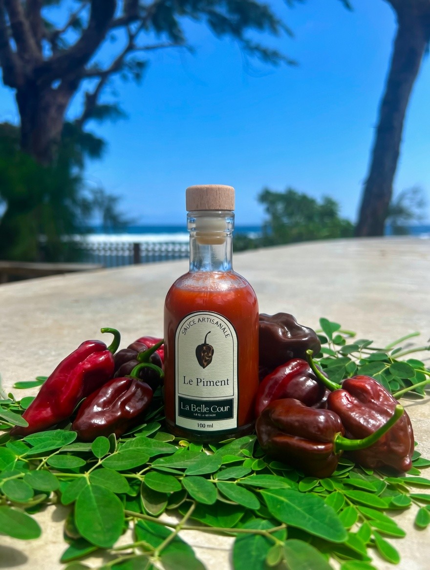 Élaborée avec exigence par La Belle Cour, cette sauce artisanale au piment révèle toute l’identité du moringa bio cultivé à La Réunion, dans une interprétation audacieuse et parfaitement équilibrée. Pensée comme un condiment de dégustation, elle associe la force aromatique du piment habanero chocolat à la subtilité végétale d’un vinaigre de cidre infusé aux feuilles de moringa.