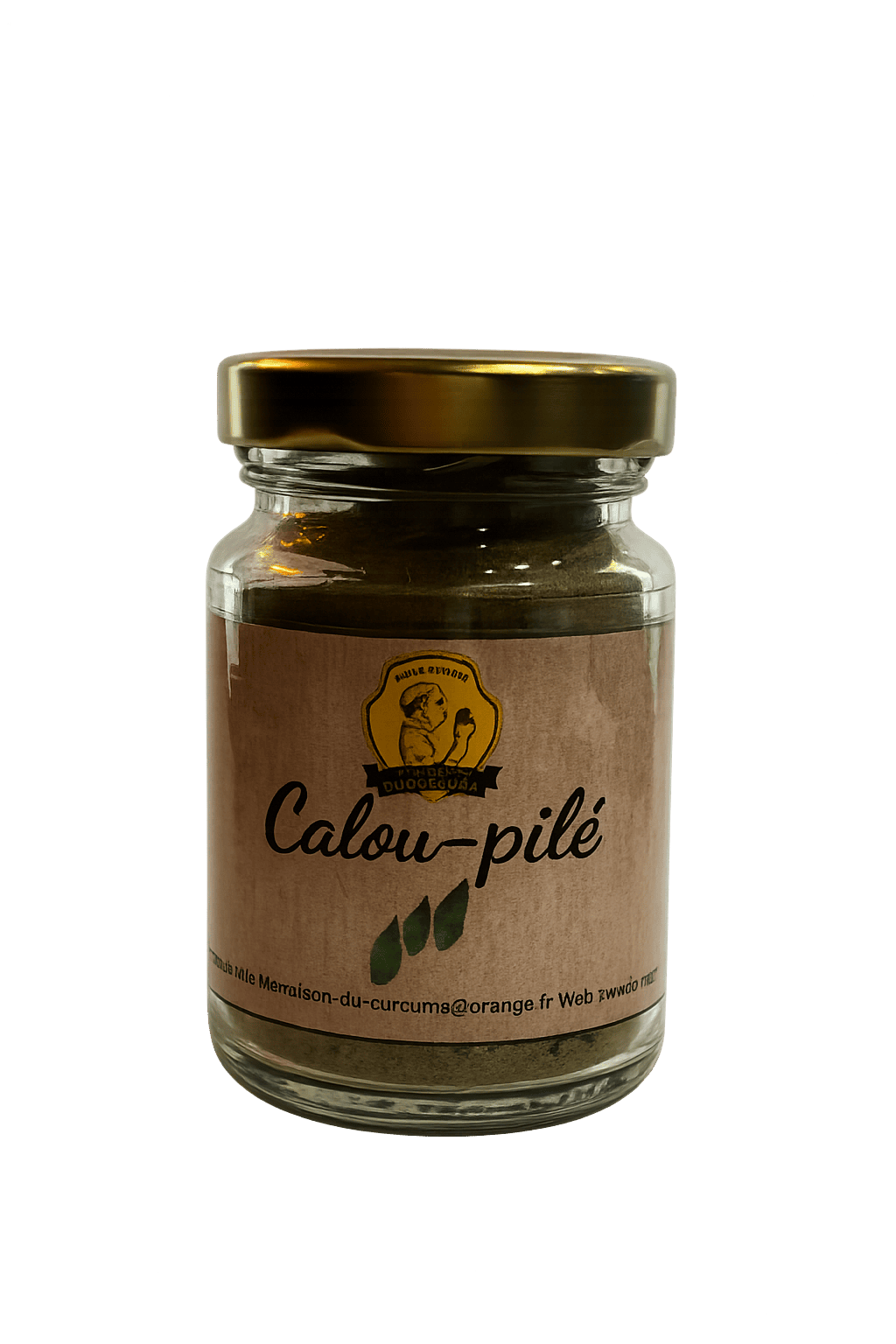 Le Calou Pilé de La Maison du Curcuma – Mémé Rivière est une préparation traditionnelle obtenue à partir de feuilles soigneusement séchées puis finement pilées, afin d’en préserver toute la richesse aromatique.Puissant, végétal et légèrement poivré, le calou pilé développe un parfum profond et frais à la fois. Son profil aromatique est caractérisé par des notes herbacées marquées, une belle intensité en bouche et une longueur persistante qui structure les plats sans les dominer. Il apporte immédiatement une signature culinaire authentique, typique des préparations traditionnelles créoles.