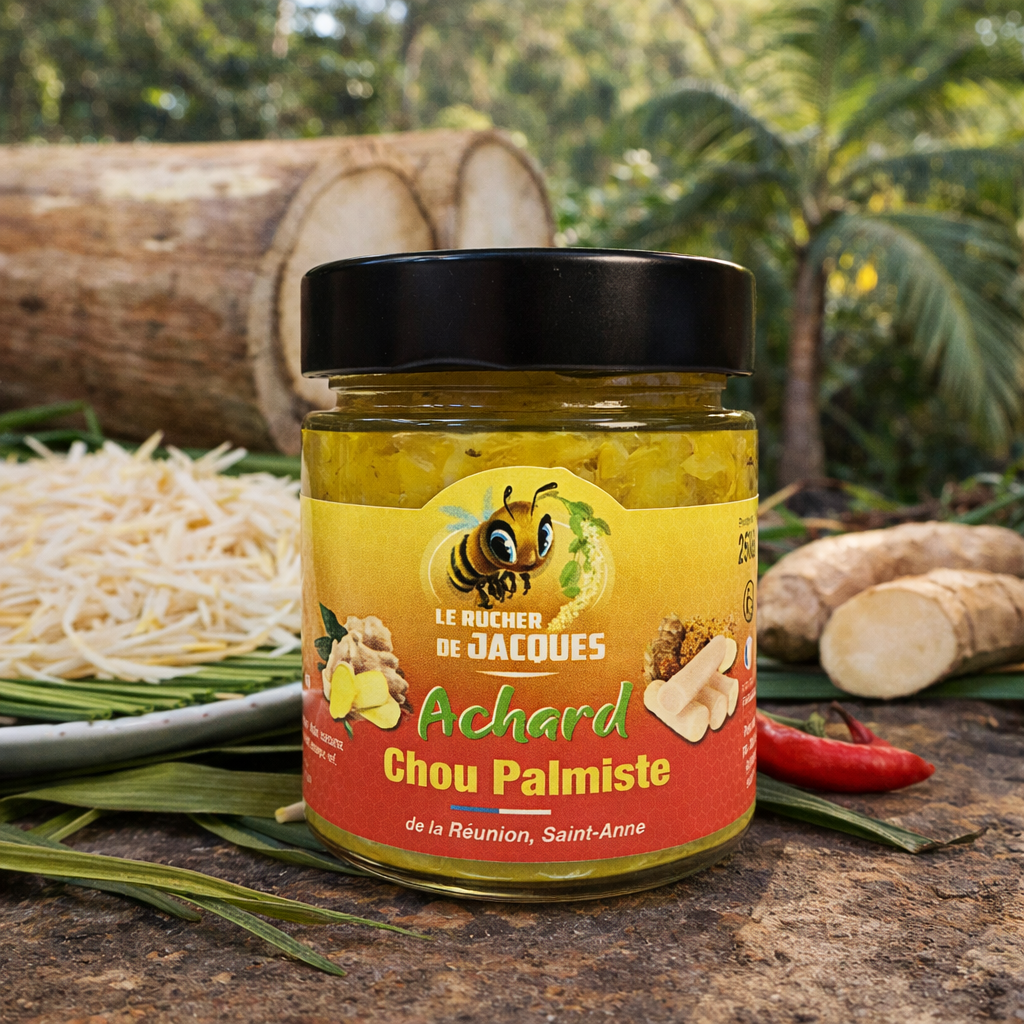 L’Achard Chou Palmiste du Rucher de Jacques est une spécialité réunionnaise rare et précieuse, qui met à l’honneur l’un des trésors végétaux de l’île : le cœur de palmiste. Finement émincé, ce produit d’exception est travaillé selon la tradition des achards créoles, offrant une préparation à la fois fraîche, parfumée et subtilement relevée.