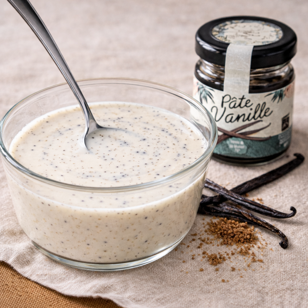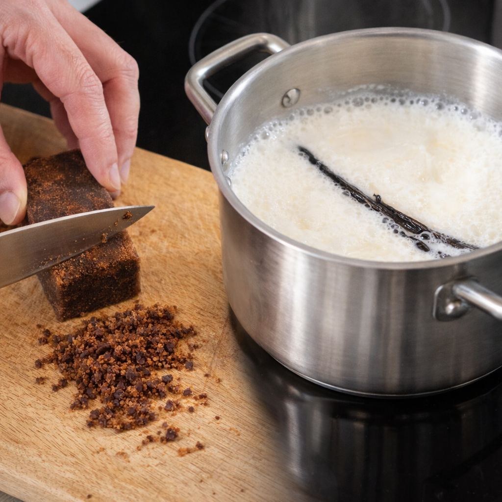 Le galabé, sucre de canne complet non raffiné, apporte des notes caramélisées profondes et un indice glycémique plus bas que les sucres blancs classiques. Associé à la richesse aromatique de la vanille Bourbon, ce dessert simple devient une véritable parenthèse gourmande, idéale pour conclure un repas sur une touche exotique et équilibrée.